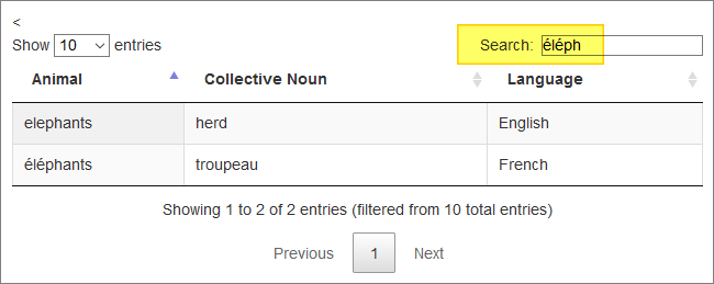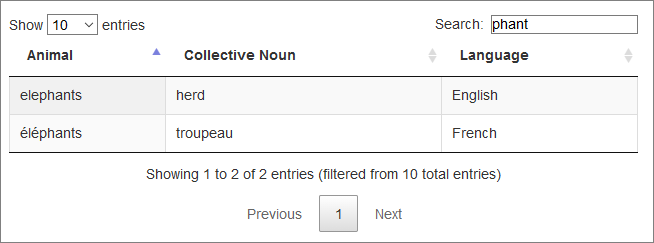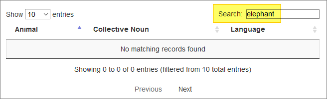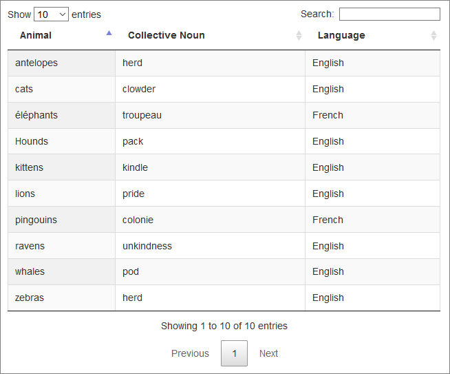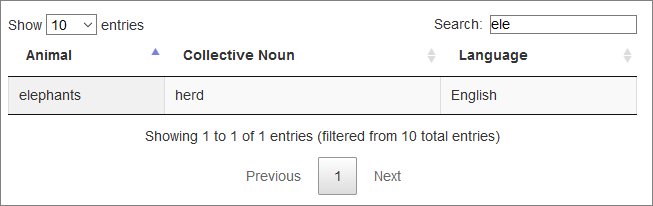 <tr><th>Animal</th><th>Collective Noun</th><th>Language</th><th>hiddenFilterData</th></tr>