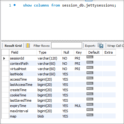 To track session data in my application, Jetty looks for a database table called jettysessions in the schema I specified. If that table does not exist, Jetty automatically creates it.