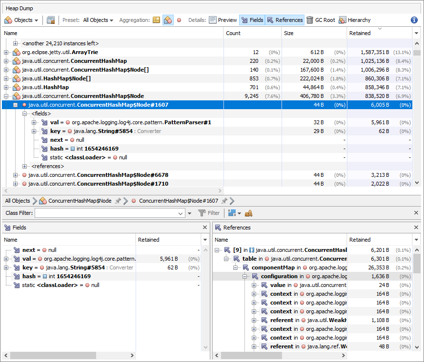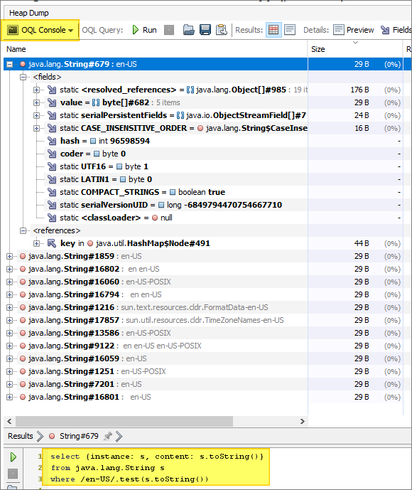 OQL (Object Query Language), a tool which is included in the heap analyzer, allows you to filter heap data in a variety of ways.