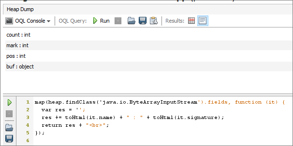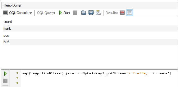 select map(heap.findClass('java.io.ByteArrayInputStream').fields, 'it.name')