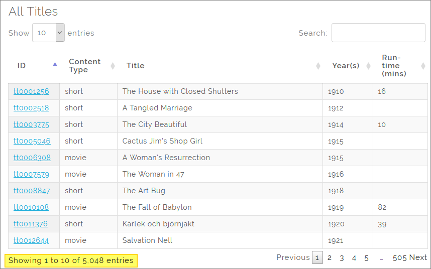 Within my web app, the 5,000 titles it does contain are all displayed in a single HTML table (albeit with client-side paging, courtesy of DataTables). But when that table is created, all 5,000 titles are sent from the server.