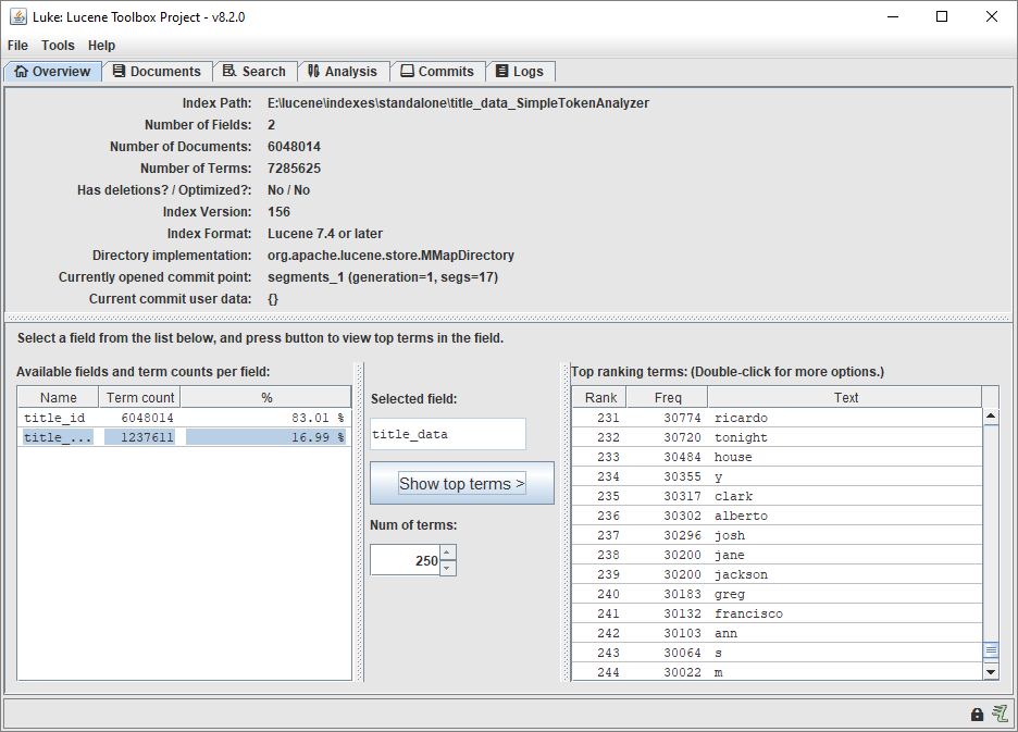 Luke is an analysis tool for Lucene. It’s available as a JAR file (lucene-luke-8.x.x.jar), which can be found in the main Lucene binary release package (downloadable from this page).