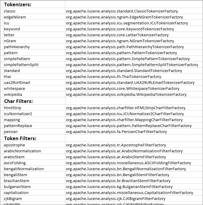In my demo lookup service, I used two analyzers: SimpleTokenAnalyzer and Ngram35Analyzer. I used class references to assemble the various analyzers, tokenizers and token filters I wanted to use.