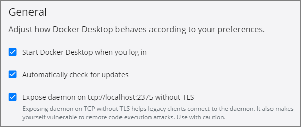To enable HTTP access in my Windows host environment, I use the following setting (Docker Desktop > Settings > General):