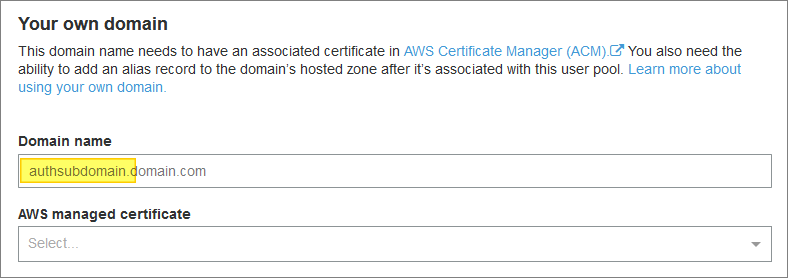 Option 2a: I can get one of those free wildcard certs from Amazon (see earlier), and use that. Using a wildcard cert will allow me to use whatever subdomain I want for my Cognito domain name (auth or anything else). But, as we noted earlier, I can only use this cert within some specific AWS services. I can’t use it in my web server - even if that web server is running on an Amazon EC2 instance.