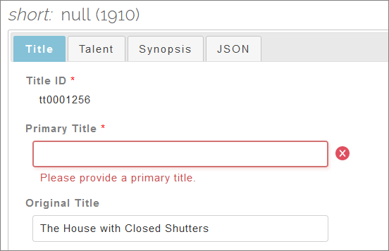 Another variation is that some fields (such as Title ID above) are part of an HTML form but are not directly editable - for example, they are the primary key value. We still want this value to be submitted to the server as part of the overall set of form data, so we want to support read-only input fields in our form, too.
