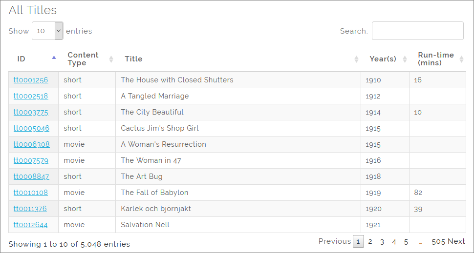 "${resultBean.id}""${resultBean.contentType}""${resultBean.primaryTitle}"These have now become standard Thymeleaf expressions to access Title getters, so that the related data can be displayed in each cell of a table row.