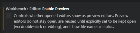This ensures each single-click on a file causes the file to open in a new editor tab, instead of replacing the previously opened tab. (I tend to expect a file to open in this way without needing to double-click on it.)